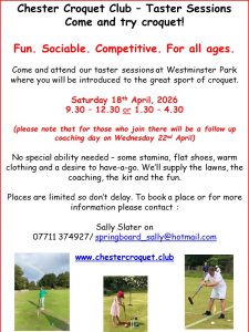 Our next taster session for newcomers who would like to try their hand at croquet will be on Saturday, 18 April 2026. Further details are shown below. If you are interested in taking part, please contact our new members and beginners organiser, Sally Slater, at 07711 374927 or springboard_sally@hotmail.com .